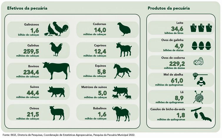 Em 2022, segundo o IBGE, o Brasil contava com mais de 1 bilhão e meio de cabeças, sendo que os galináceos lideravam o cenário, seguidos de bovinos e suínos, com mais de 44 milhões de cabeças. Mas a contribuição da pecuária vai muito além dos números econômicos
